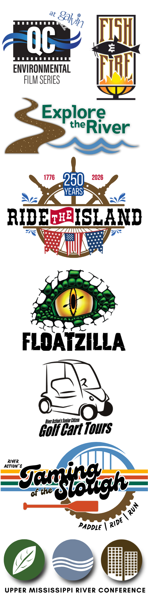 River Action Event Calendar Click on the event date for more info or to register! JANUARY 18 - MARCH 1, 2026 QC Environmental Film Series MARCH 26, 2026 Henry Farnam Evening APRIL 30, 2026 - Fish & Fire Friendraiser Dinner SUMMER 2026 - Explore the River Series FATHER'S DAY, JUNE 21, 2026 - Ride the Island AUGUST 15, 2026 - Floatzilla Paddle Event SEPTEMBER 3 & 4, 2026 - Senior Golf Cart Tours SEPTEMBER 12, 2026 - Taming of the Slough Adventure Race NOVEMBER 4-5, 2026 - Upper Mississippi River Conference CLICK HERE to download a PDF of our events calendar SUBSCRIBE to our ACTION News e-newsletter to stay up to date on River Action's events and programs. Click below to make a general donation to River Action via PayPal.
